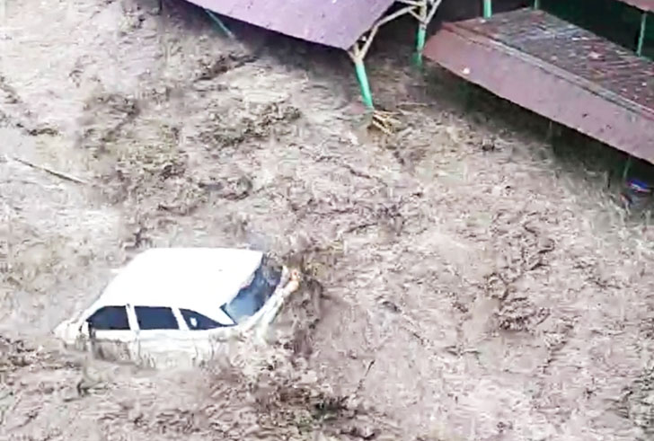 Akibat banjir bandang ini, air bercampur lumpur tumpah ruah ke ruas jalan. Kendaraan yang ingin melintas terpaksa diminta berputar arah.